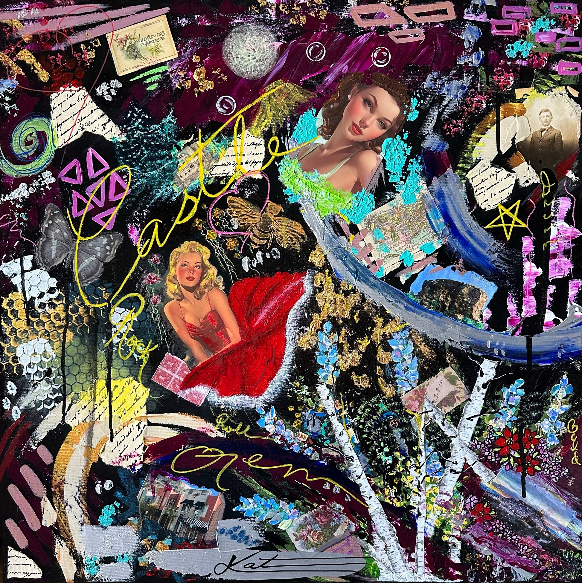 Castle Rock is a mixed media piece with acrylics and mixed accents on a 30" X 30" canvas with a variety of texture and images that is full of imagination