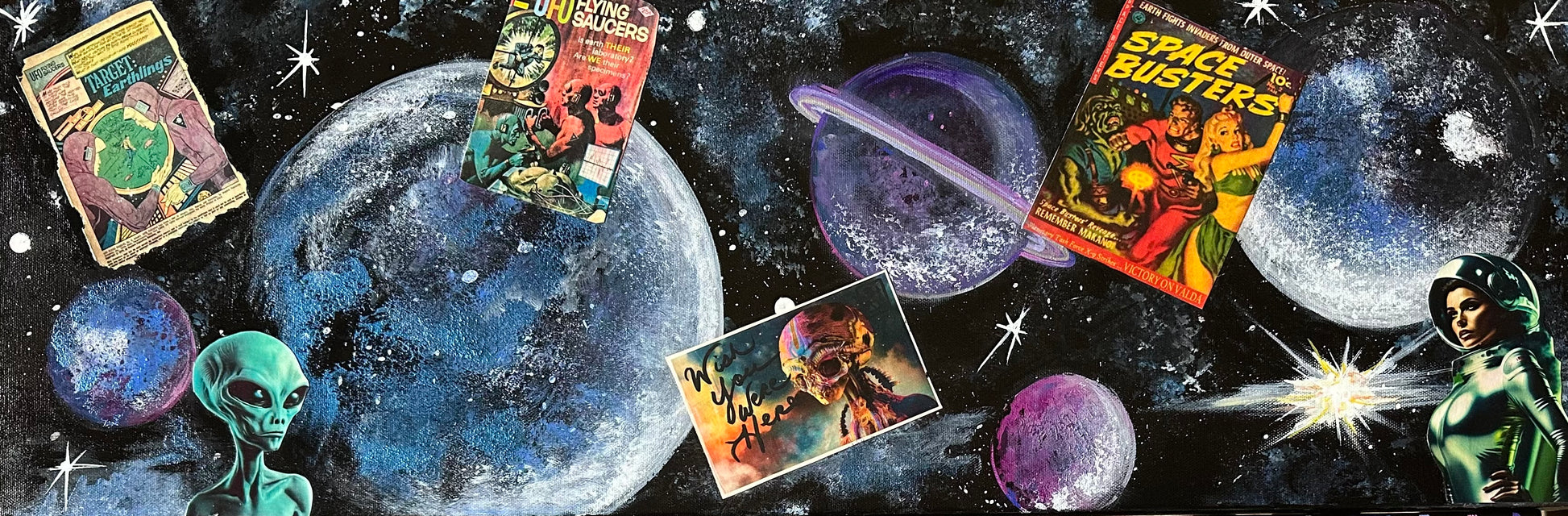 30" wide by 10' high hand painted acrylics on canvas with mixed collage of postcards, comic book pages and pictures